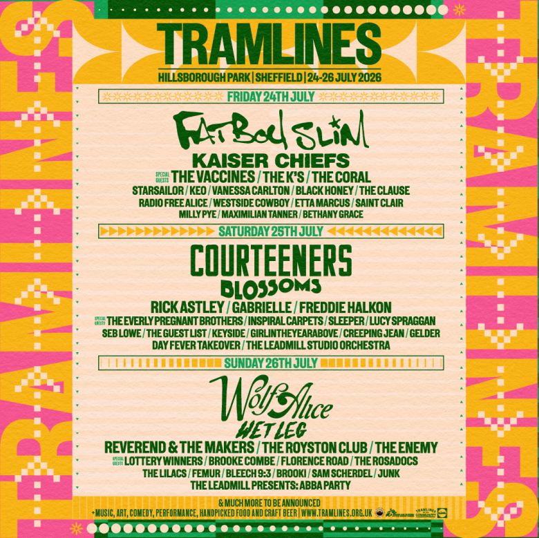 Tramlines Festival has confirmed the first wave of artists set to perform at Hillsborough Park from 24 to 26 July 2026. The line-up boasts headliners Fatboy Slim, Courteeners, and Wolf Alice, with additional performances from Kaiser Chiefs, Blossoms, Wet Leg, and more.